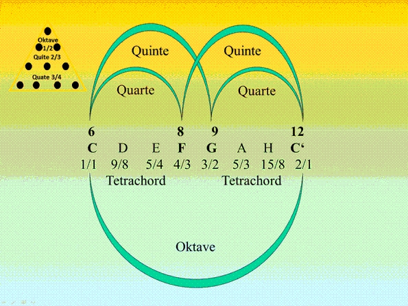 Weiterhin ging er auf den Zusammenhang zwischen den in der Antike üblichen Intervallgruppen, Tetrachord genannt, und der Tetraktys ein, die im griechischen Alterum von hoher symbolische Bedeutung war (siehe dazu im Internet „Tetraktys“).